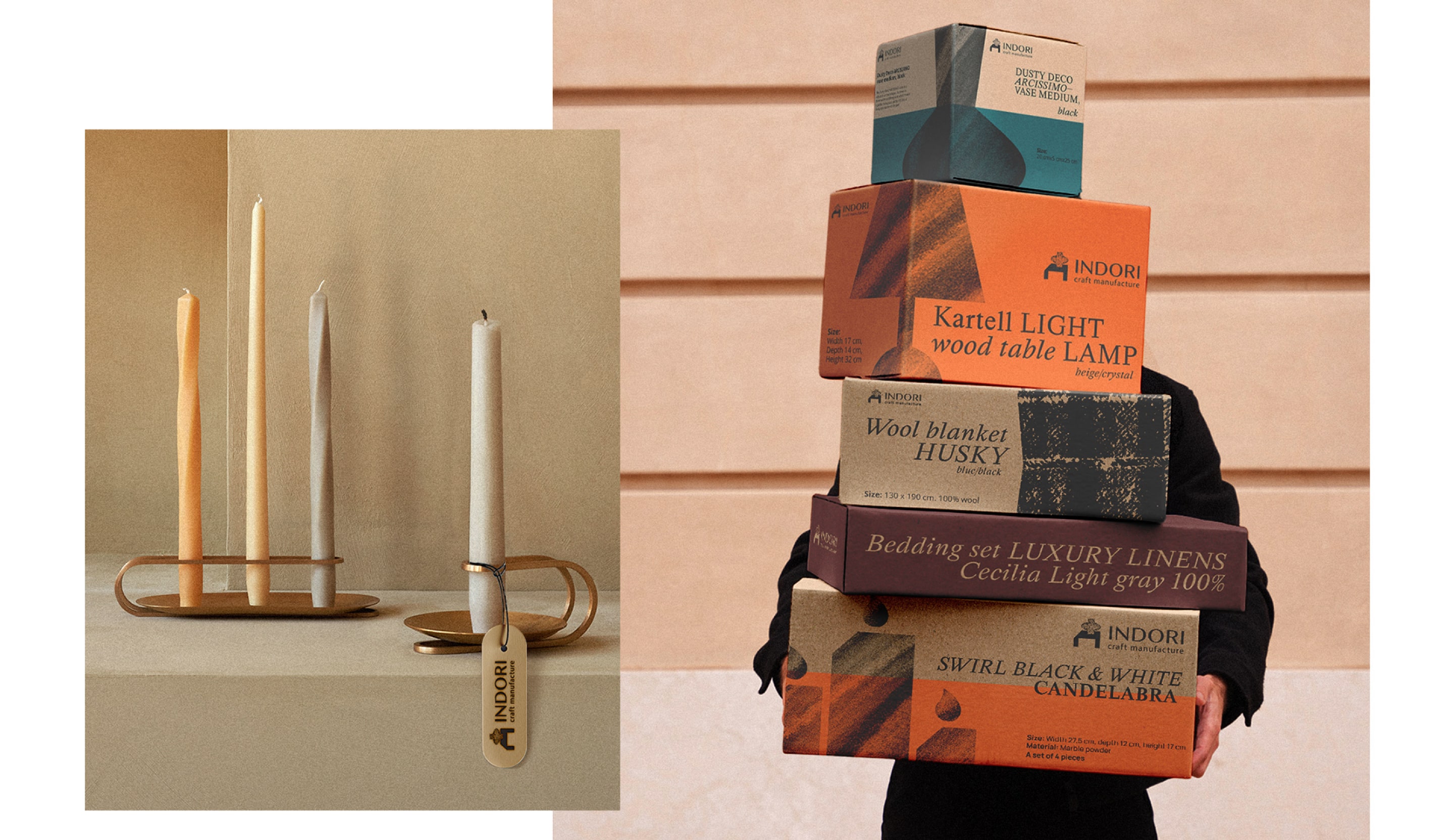 Розроблено фірмовий стиль, який передає суть бренду. Він говорить про ручну роботу та довговічну якість продукції Indori. У типографіці використовується курсив та пряме накреслення, що додає унікальності. Графічні елементи — це ілюстрації основних виробів бренду, вони містять текстуру (тканина, глина, дерево), яка підкреслює крафтовий характер бренду та використання виключно природніх матеріалів.